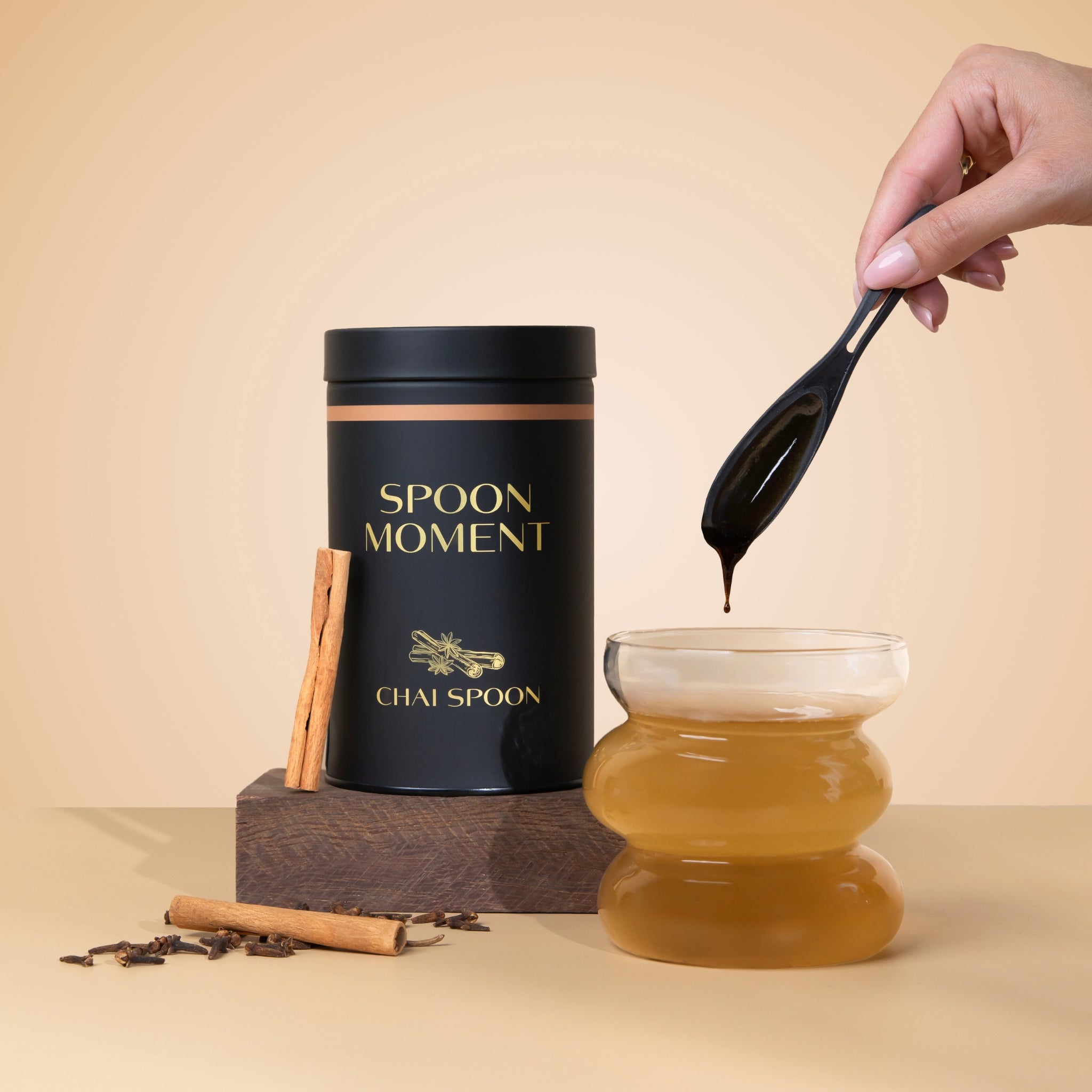 Theelepel gevuld met Indiase Masala Chai mix en 100% natuurlijke Turkse dennenhoning. Roer de spoon door een warme drank en geniet van jouw Spoon Moment!